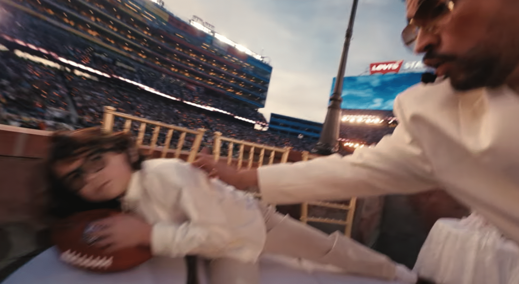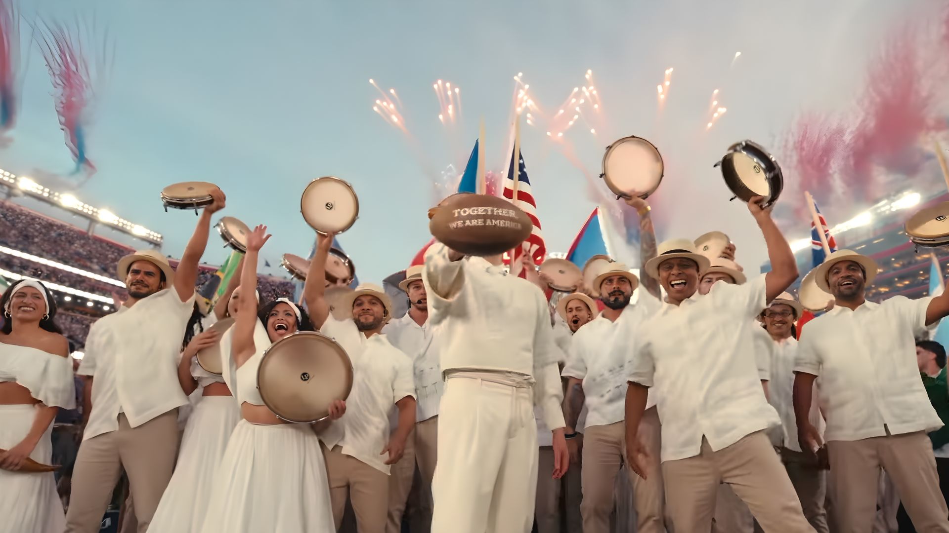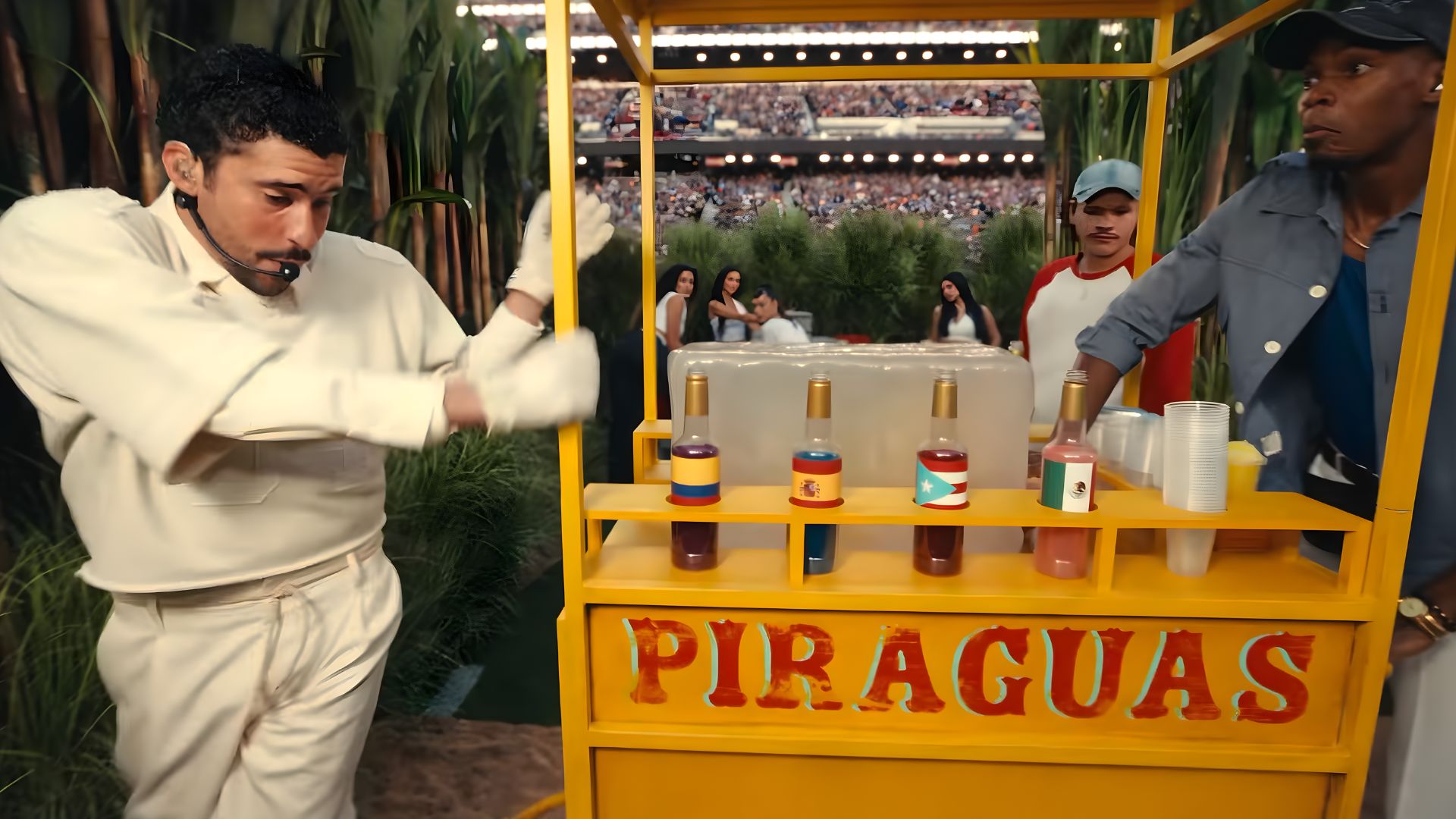 As he moves down the field, Bad Bunny weaves past everyday staples of the island, from a coco frío stand to a piragua cart, passing through boxers and a neighborhood jeweler, each one a real local business rooted in Puerto Rico. Making his way to the casita — similar to the one from his “No Me Quiero Ir De Aquí” residency — filled with celebrity guests like Karol G, Pedro Pascal, Cardi B, and Jessica Alba, the party is about to really get started.