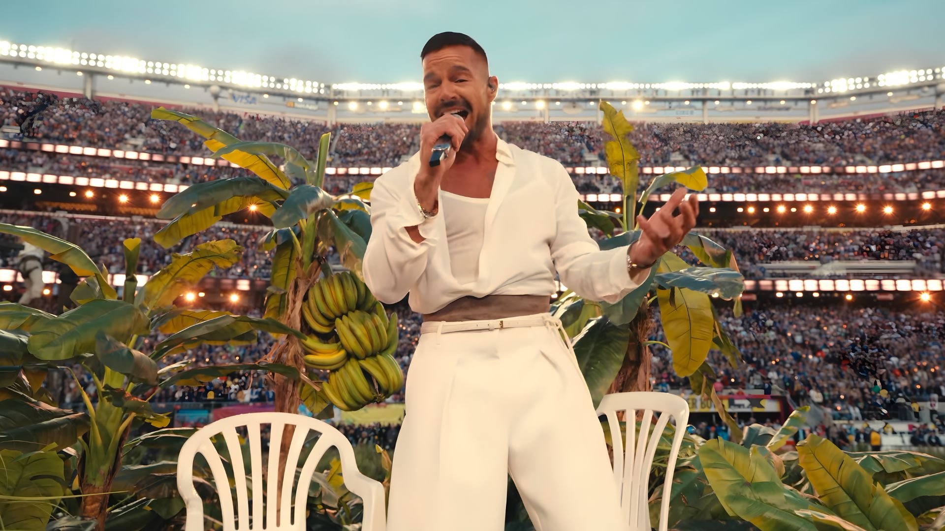 Ricky Martin, another one of the night’s special guests, sat in a white plastic chair against a backdrop identical to the DeBÍ TiRAR MáS FOToS album cover to perform “LO QUE LE PASÓ A HAWAii.” The song explores ongoing displacement driven by rising costs, natural disasters, and the energy crisis in Puerto Rico, pleading that the island not face the same fate as Hawaii.